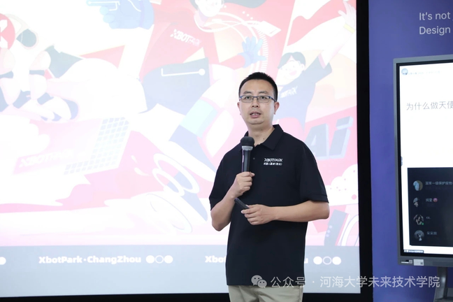 XbotPark机器人基地(常州)副总经理王豫平为营员们讲授开营首课,深入解读体系从新工科教育到硬科技孵化的完整链路,并详细解析营期任务与创新工具。互动环节中,他针对学生提出的创业痛点逐一解答,现场反响热烈。