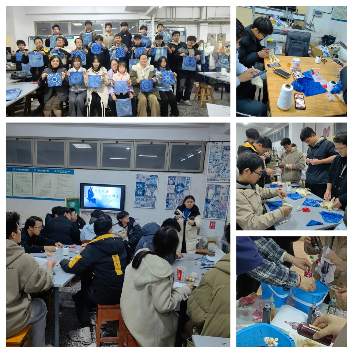 在实践环节,同学们充分发挥创意与想象力,通过不同的折叠与捆扎方式,在方巾与布包上精心设计纹样。大家沉浸于手工创作的专注过程,在一折一扎、一浸一染之间,体验传统技艺的独特魅力。活动现场,工作人员全程提供细致指导与协助,确保每位参与者顺利完整体验。