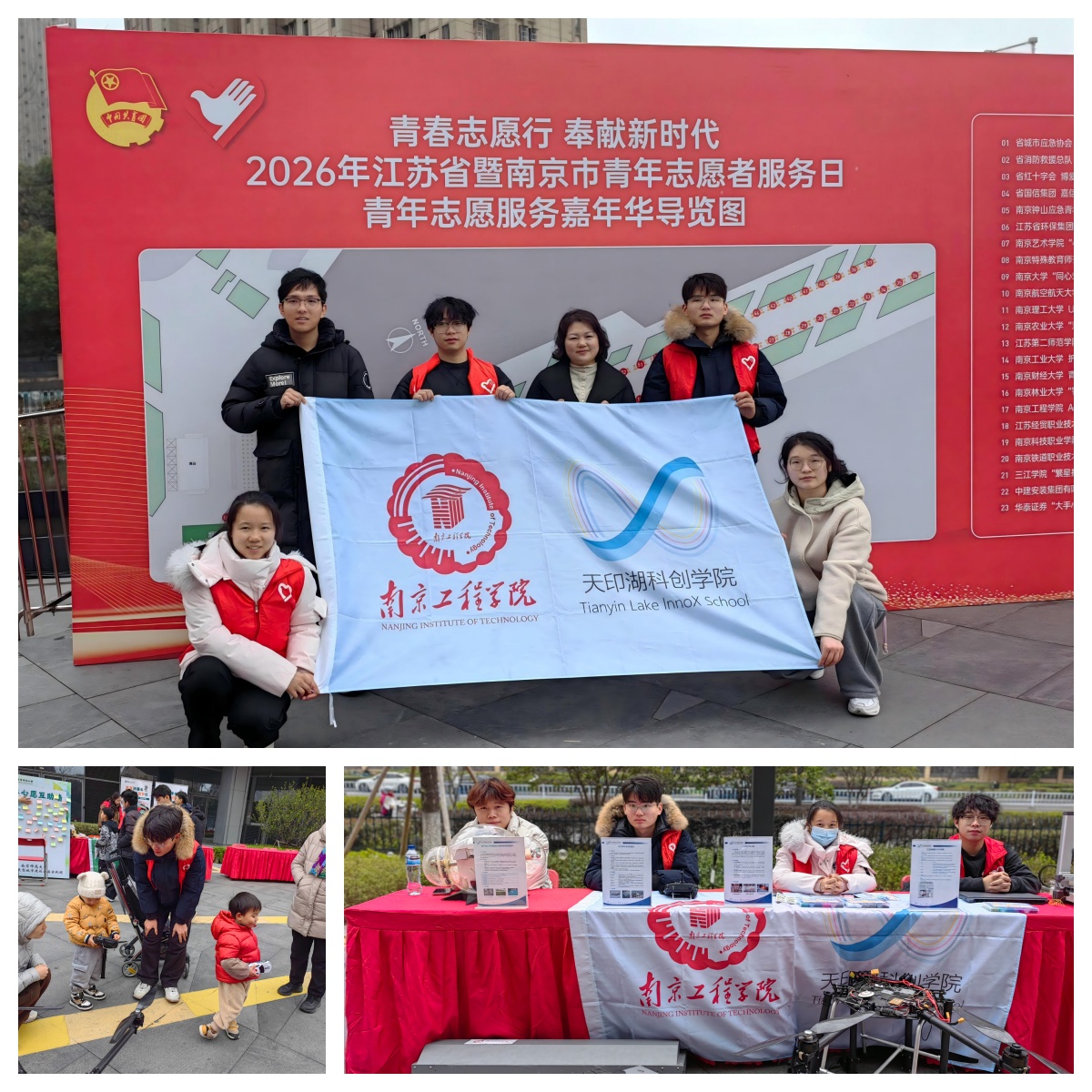 3月3日,在第27个中国青年志愿者服务日到来之际,由共青团江苏省委、省委社会工作部、省体育局、交通银行江苏省分行、省青年志愿者协会联合主办的“青春志愿行 奉献新时代”2026年江苏省暨南京市青年志愿者服务日活动在南京金陵天地广场举行。我院“天印智启”志愿服务队,应邀参与青年志愿服务市集展示,与来自江苏省级机关、省部属企业、高校、社会组织的66支青年志愿服务队齐聚一堂,以人工智能科普教育为核心,用硬核科技与趣味互动,向社会公众展现南工程学子的创新风采与志愿精神。