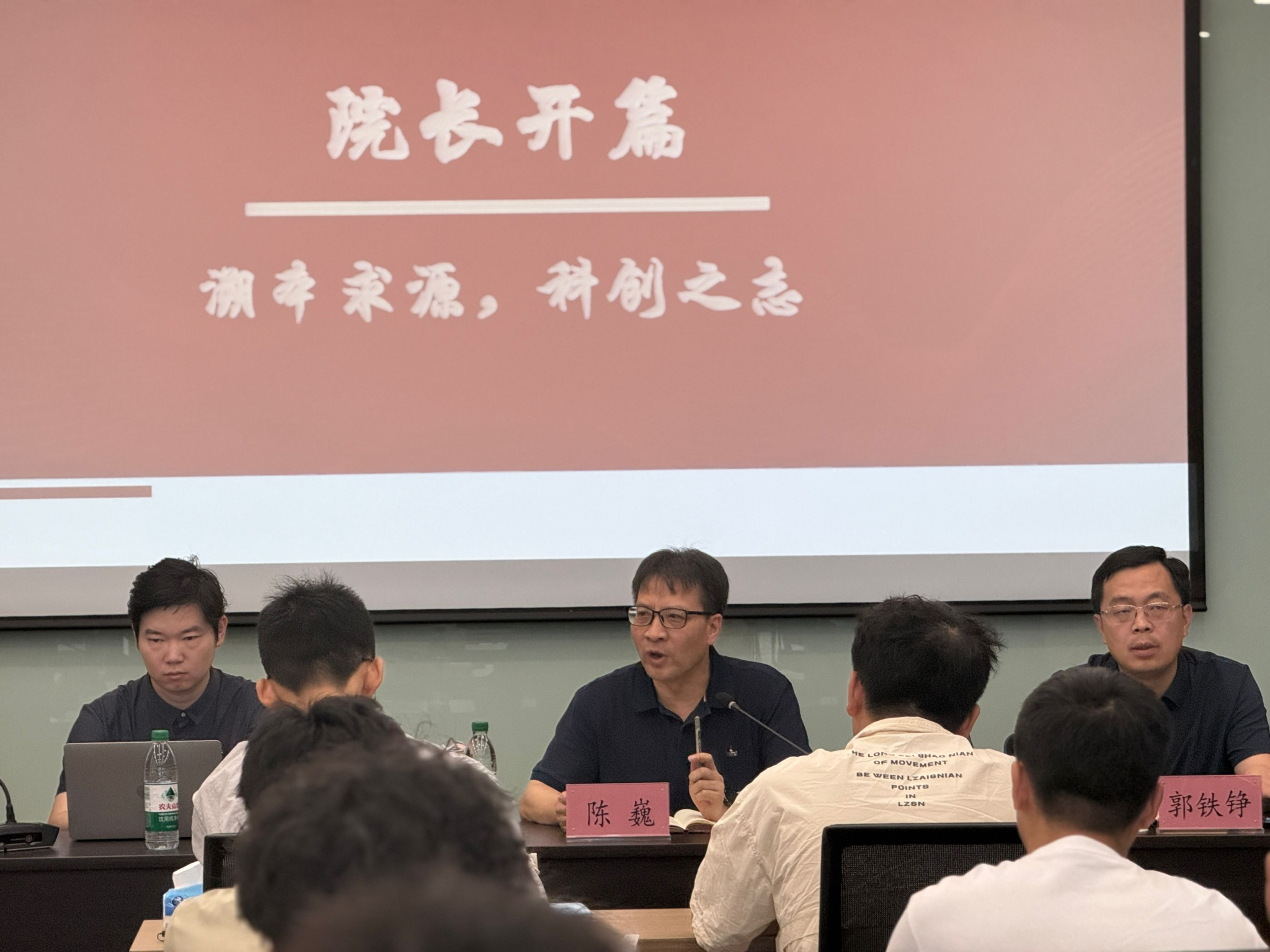 典礼在庄严的氛围中拉开帷幕。院长陈巍首先为新生带来“开篇第一课”。他以“溯本求源,科创之志”为题,深情回溯学院的创办初心与发展脉络,深刻阐述了科创精神在时代发展中的核心价值。他勉励新生要立大志、明大德,将个人理想融入国家科技发展的洪流之中,在天印湖这片沃土上夯实根基,追寻属于自己的科创梦想。