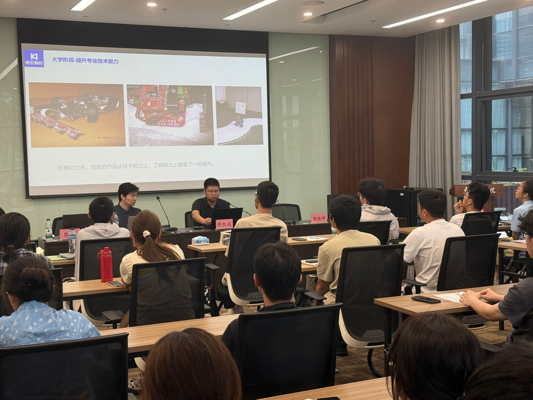 随后,教师代表洪儒博士以“科创启思:前沿探索,创新为帆”为主题,为同学们带来了一场生动的科技创新动员。他从当前全球科技前沿动态切入,分享了多个激动人心的创新案例,激发了同学们的浓厚兴趣与无限遐想。他鼓励大家要保持好奇、勇于质疑、敢于实践,将创新的思维转化为解决问题的实际能力。